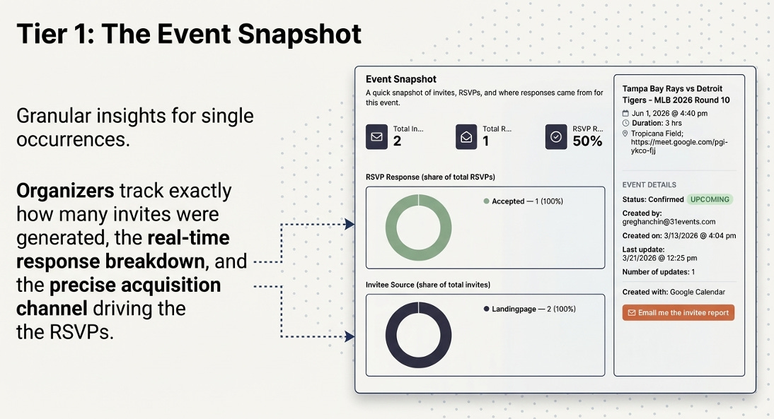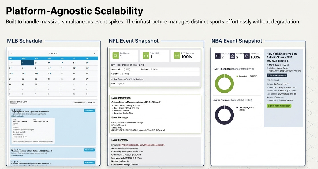 By removing the friction of manual entry and replacing it with one-click native invitations, brands can secure a permanent spot on their audience’s most valuable real estate: their time and track detailed game analytics for fan engagement across the organizer and the domain owner.