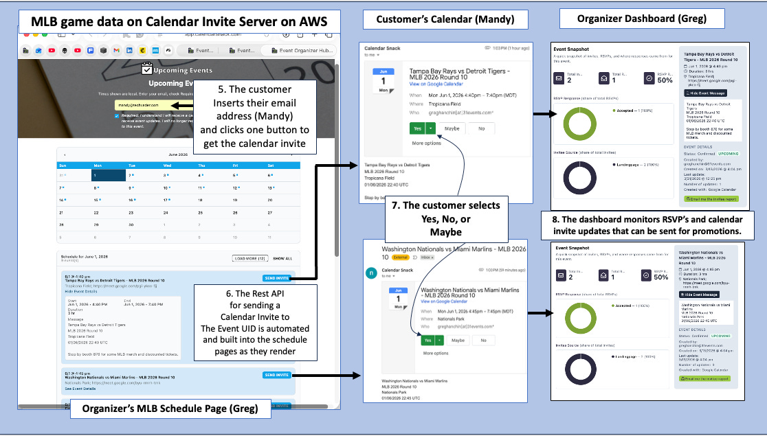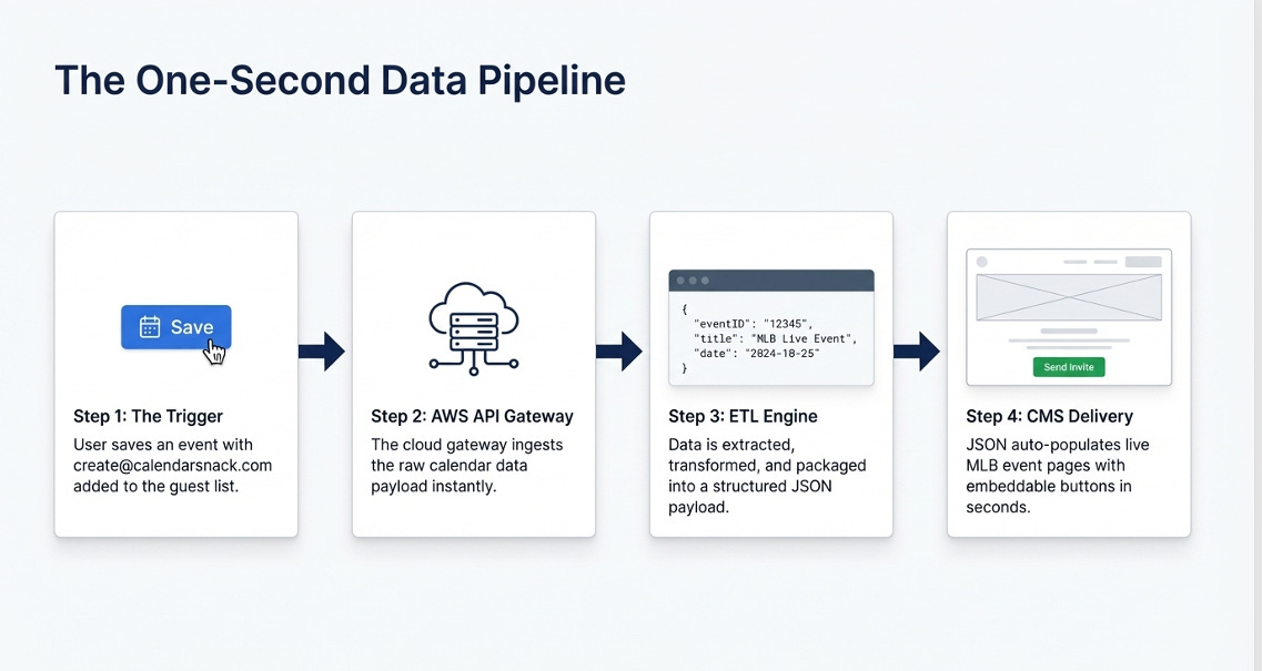By forwarding the MLB schedules to create@calendarsnack.com using an AI to control the Calendar Client, the Calendar Invite Server API, and SES Inbox triggers another automated workflow that parses, validates, and stores each matchup, along with an assigned digital UID, for each game in DynamoDB.