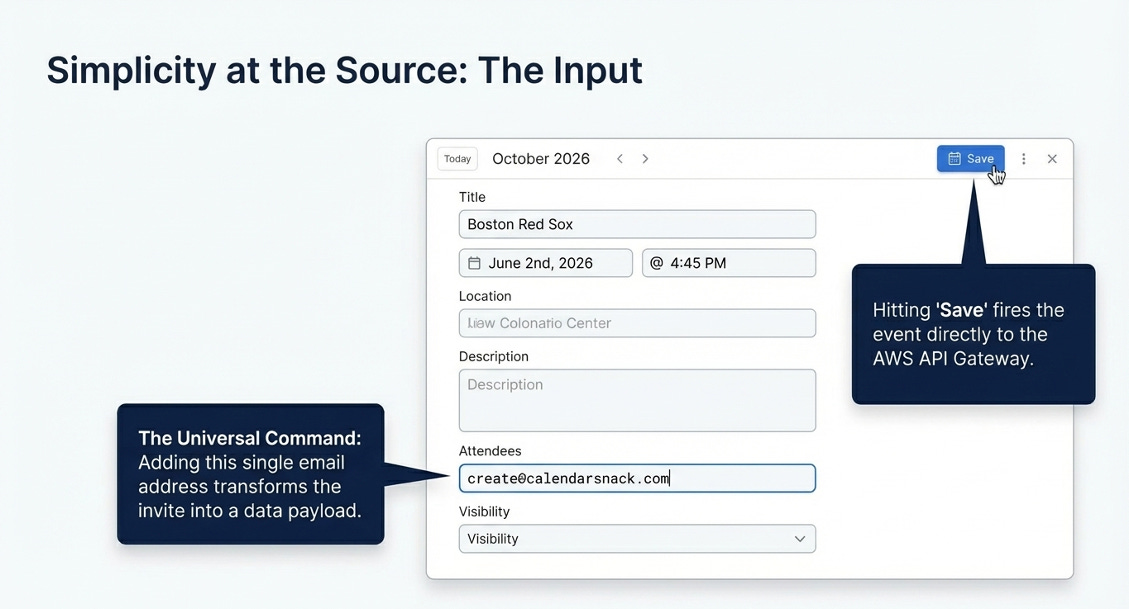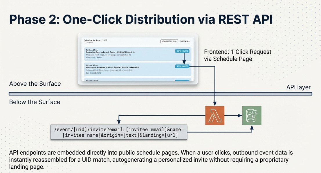 This shift moves the technical burden away from the user and onto the API Gateway, which manages the request in real time by rebuilding the calendar invite using the AWS SES RAW API, performing a DynamoDB lookup for the Game UID, and building a Multipart message to send, track, and update a real calendar invite for the fan.