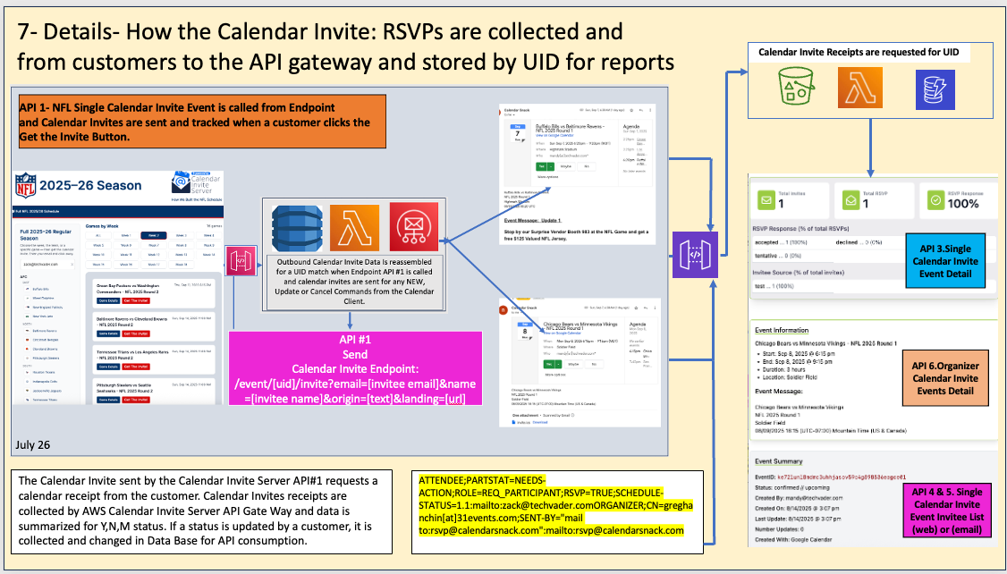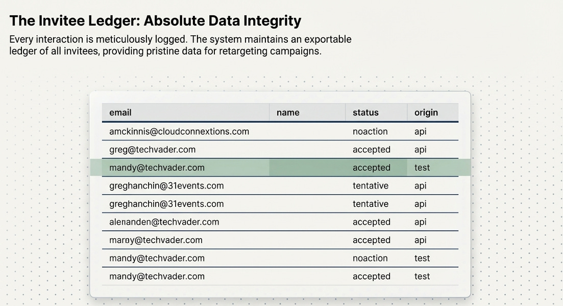 Once an invite is dispatched, the system acts as a sophisticated listening post. The API Gateway collects “Calendar Invite Receipts” to capture whether a user selects “Yes,” “No,” or “Maybe.” This data provides a level of transparency that traditional email marketing simply cannot match.