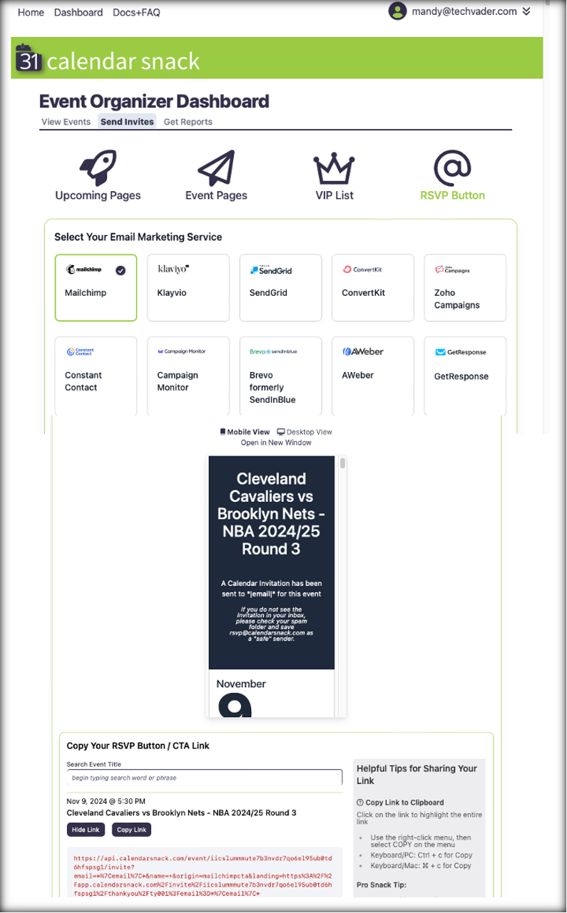 4. RSVP Button—A CTA code for the Calendar Invite Event inserted into over 50 supported Email Marketing Software vendors.