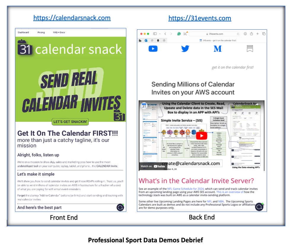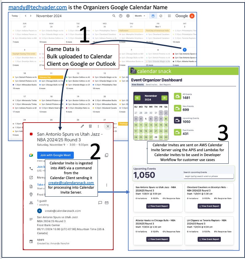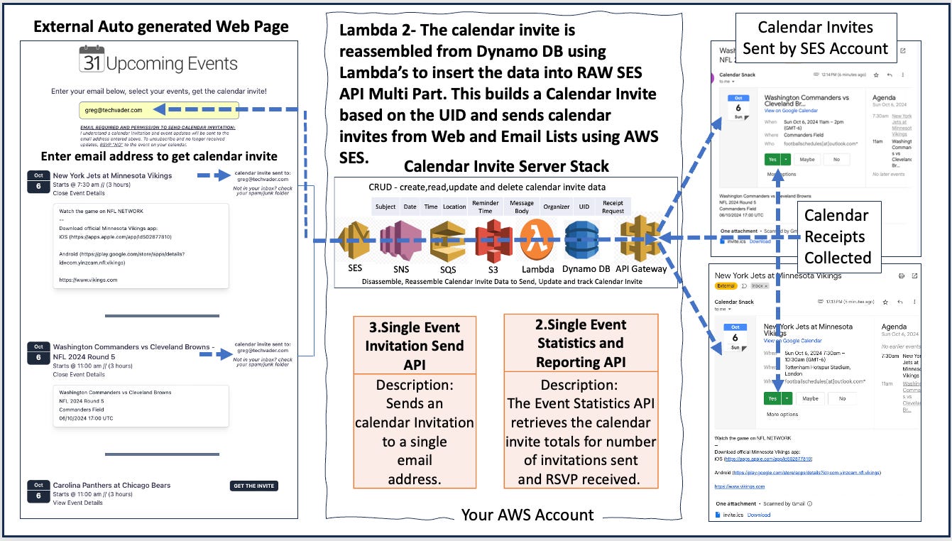 Sending a Single Calendar Invite from a Game Schedule Picker above to API #3 can be completed to AWS Pinpoint with a piece of code that communicates with the RAW SES API for that UID. The operator would then use both the AWS Pinpoint Channel email list capabilities and the Calendarsnack Application to monitor and tally the Calendar client data from the Calendar Receipts.