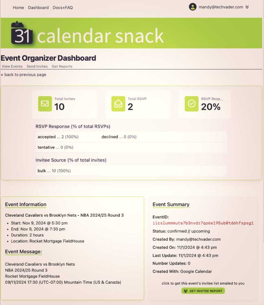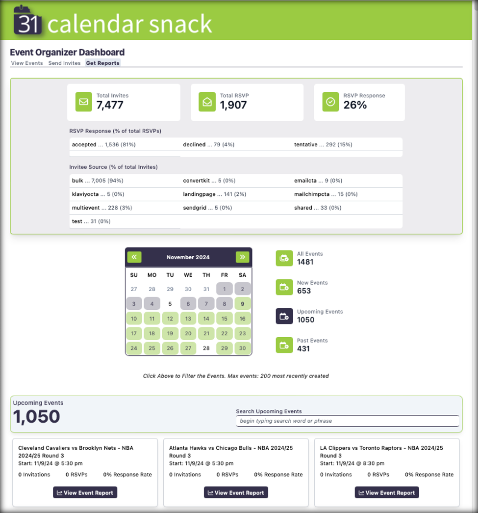 The Calendarsnack App hooks the Calendar Invite Server (CIS) APIs running in your AWS account. The Dashboard has VIEW Calendar Invites, SEND Calendar Invites, and Get Reports to review Calendar Invite receipt data.