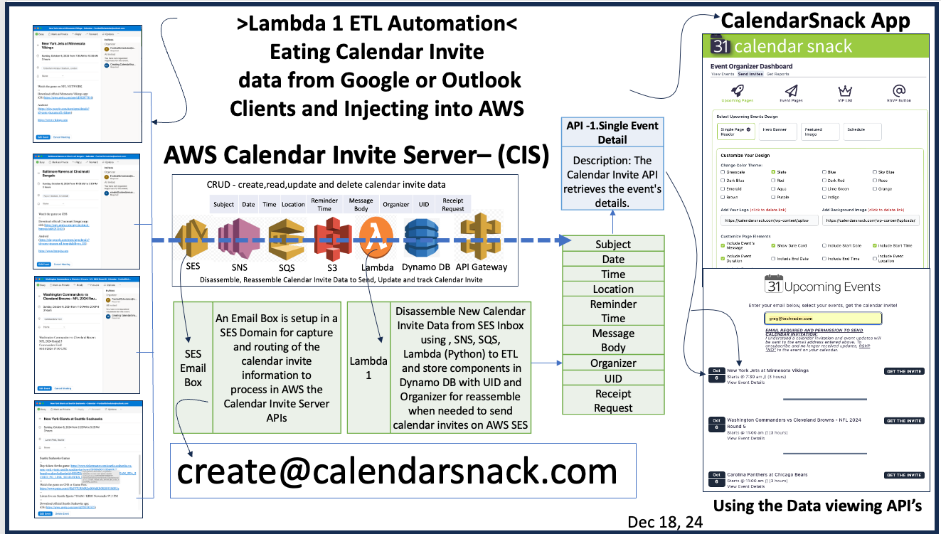 The calendar invite is disassembled and stored in AWS using a series of Lambas we built to automate and store the data in AWS.
