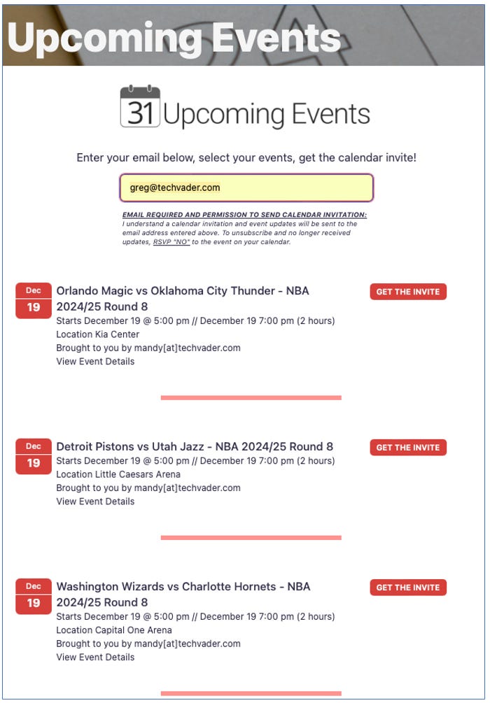 The auto-generated upcoming page loads all the future event data for the calendar invites for that organizer and has a URL for sharing on social media. Customers who select the event and click one button receive a calendar invite and are tracked.