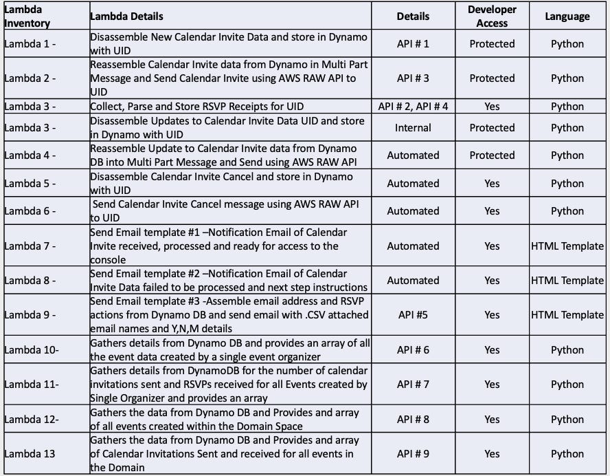 The AWS Serverless Application Module (SAM) manifest discloses all the AWS catalog items, Lambda's, and APIs used with the Calendar Invite Solution package. The packages are available via a GitHub Pull Request.