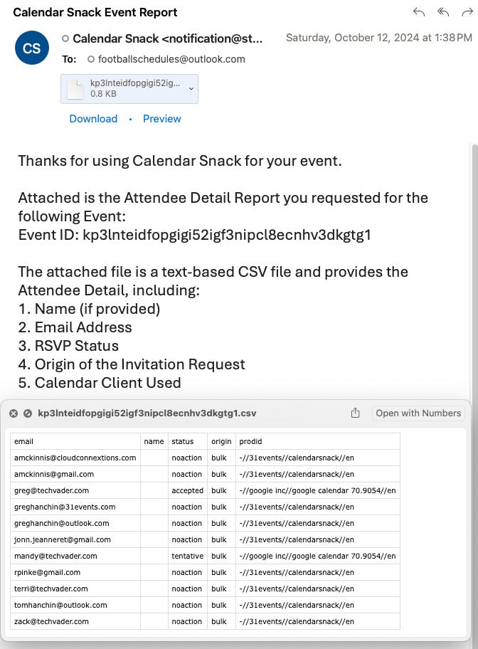 The 10-second trial to our tech is as follows: Use create@calendarsnack.com in your calendar client and copy us on the calendar invite. You will receive an email with instructions on accessing the calendarsnack data through the application's console.