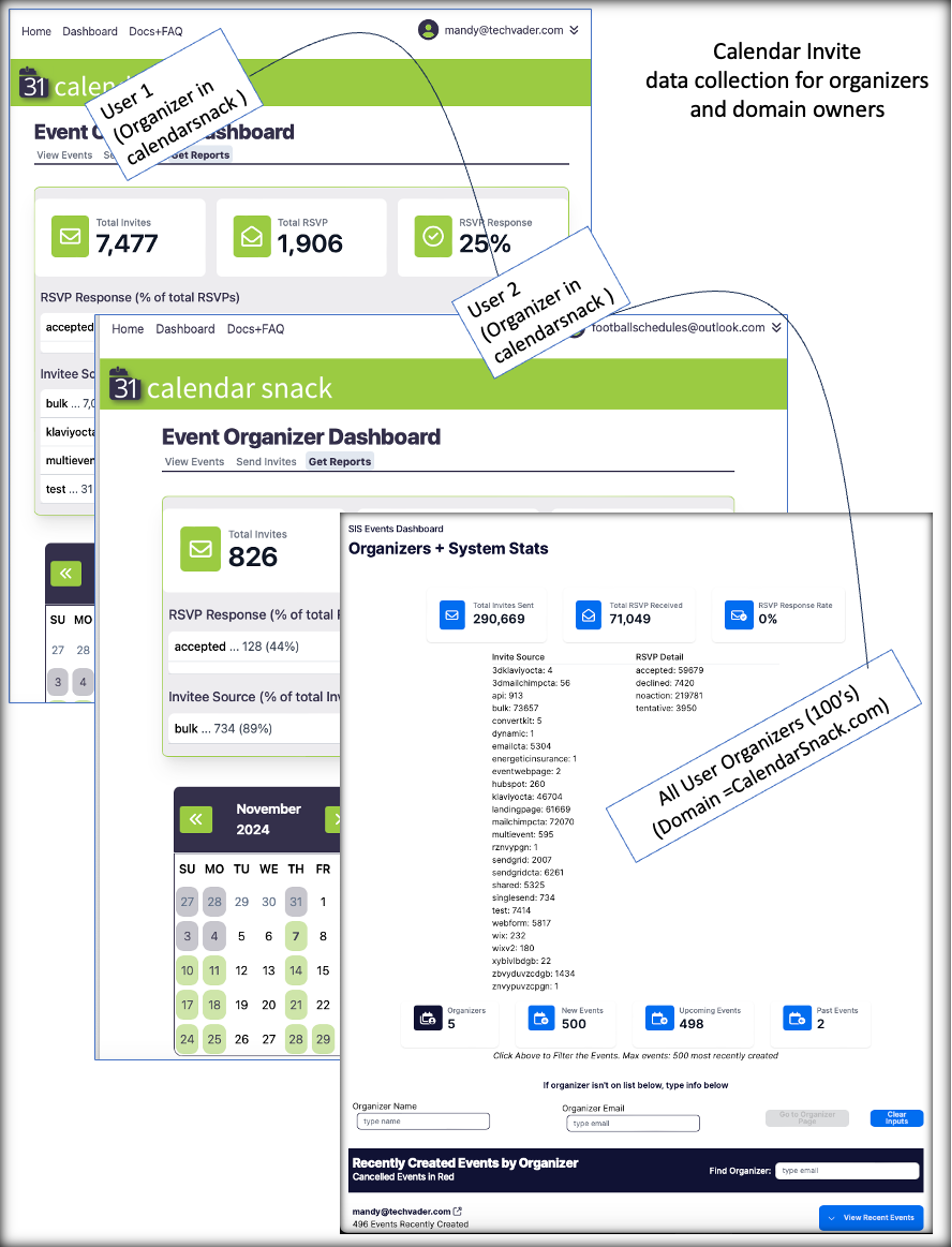 A single dashboard allows users to view, search, and report on all account data under yourdomain.com that have registered and sent calendar invites.
