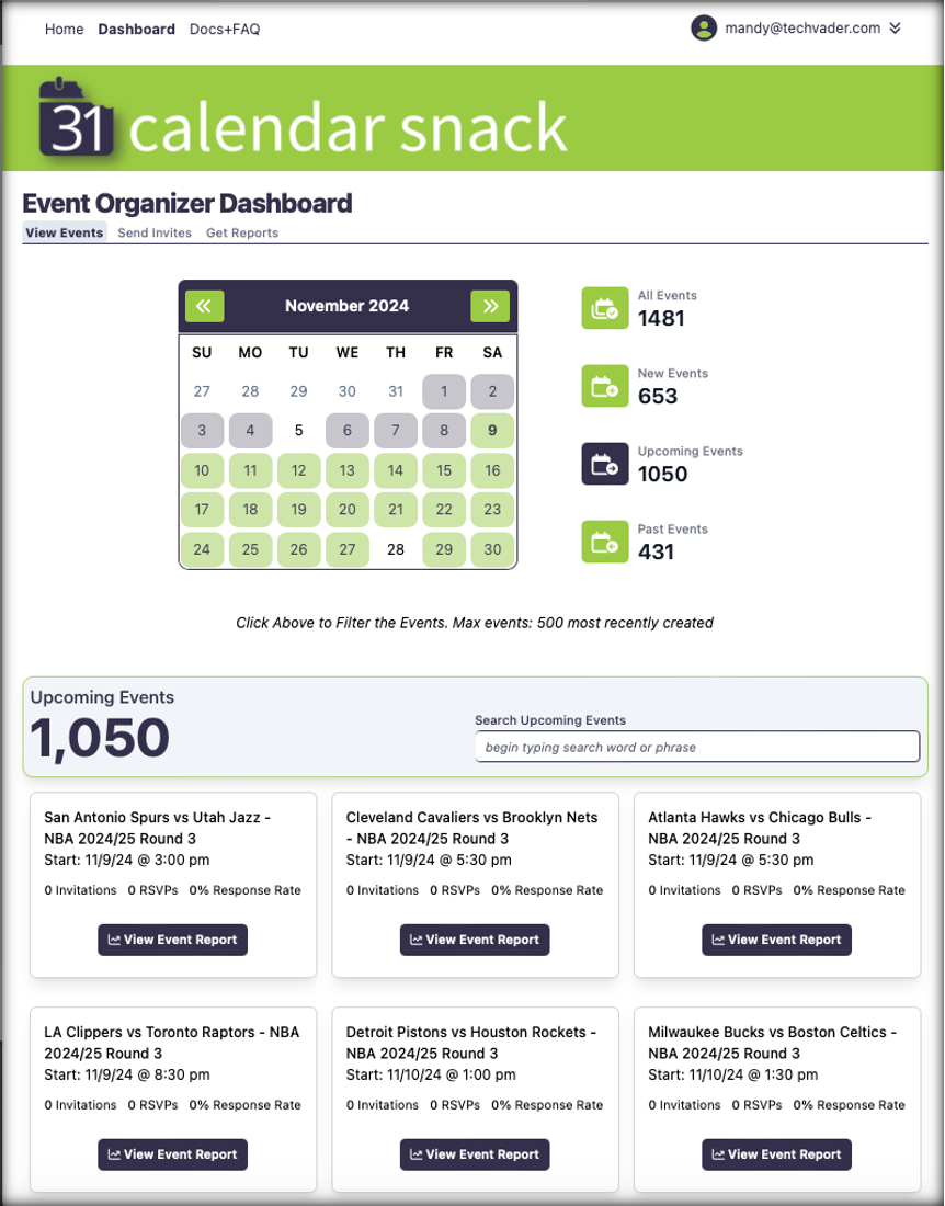 Calendar Invite Data from the Calendar Invites sent on your AWS SES account are visualized in the Calendarsnack APP by event date.