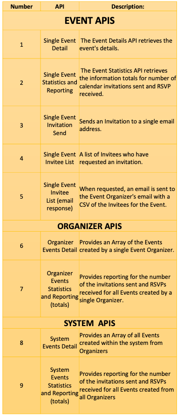EVENT API -API 1, API 2, and API 4. Organizer API - API 6, API 7