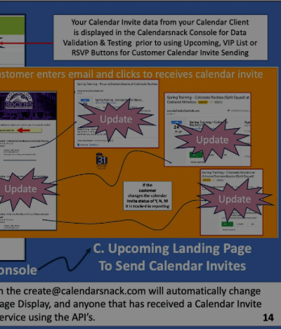 The calendarsnack application automates sending calendar invites to an email list, upcoming landing pages, or RSVP buttons for email marketing providers inside email templates, with detailed reporting using the calendar server APIS.