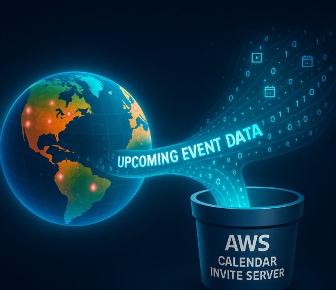 The entire process involves injecting the data into the AWS Calendar Invite Server and processing the data on Amazon with a series of Lambdas.