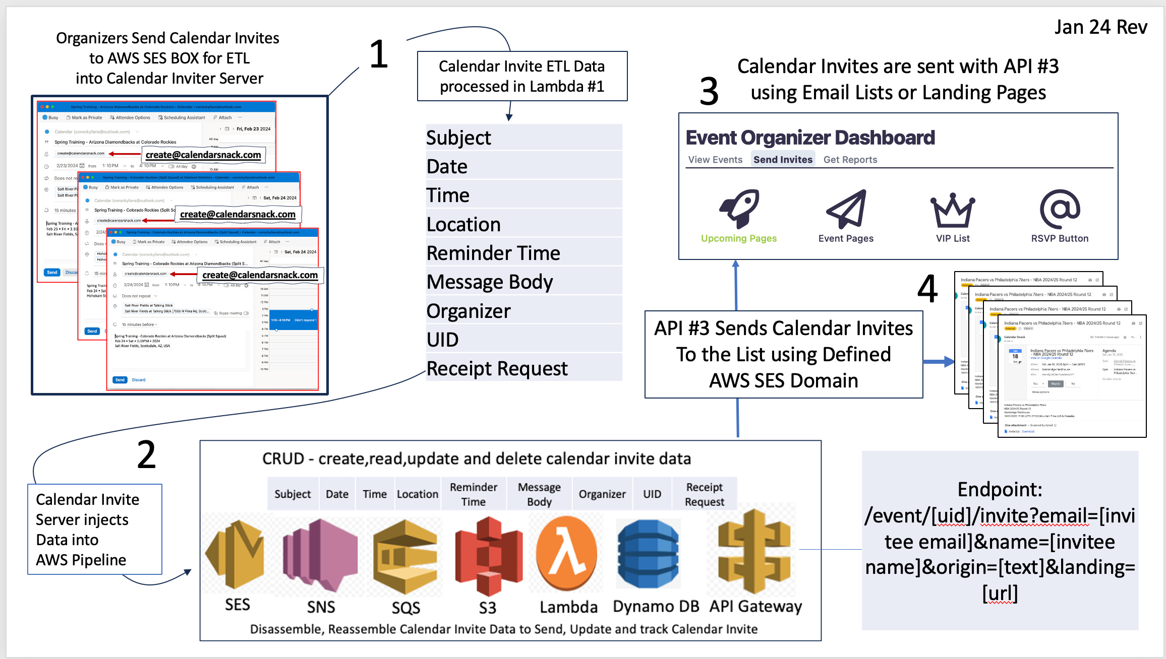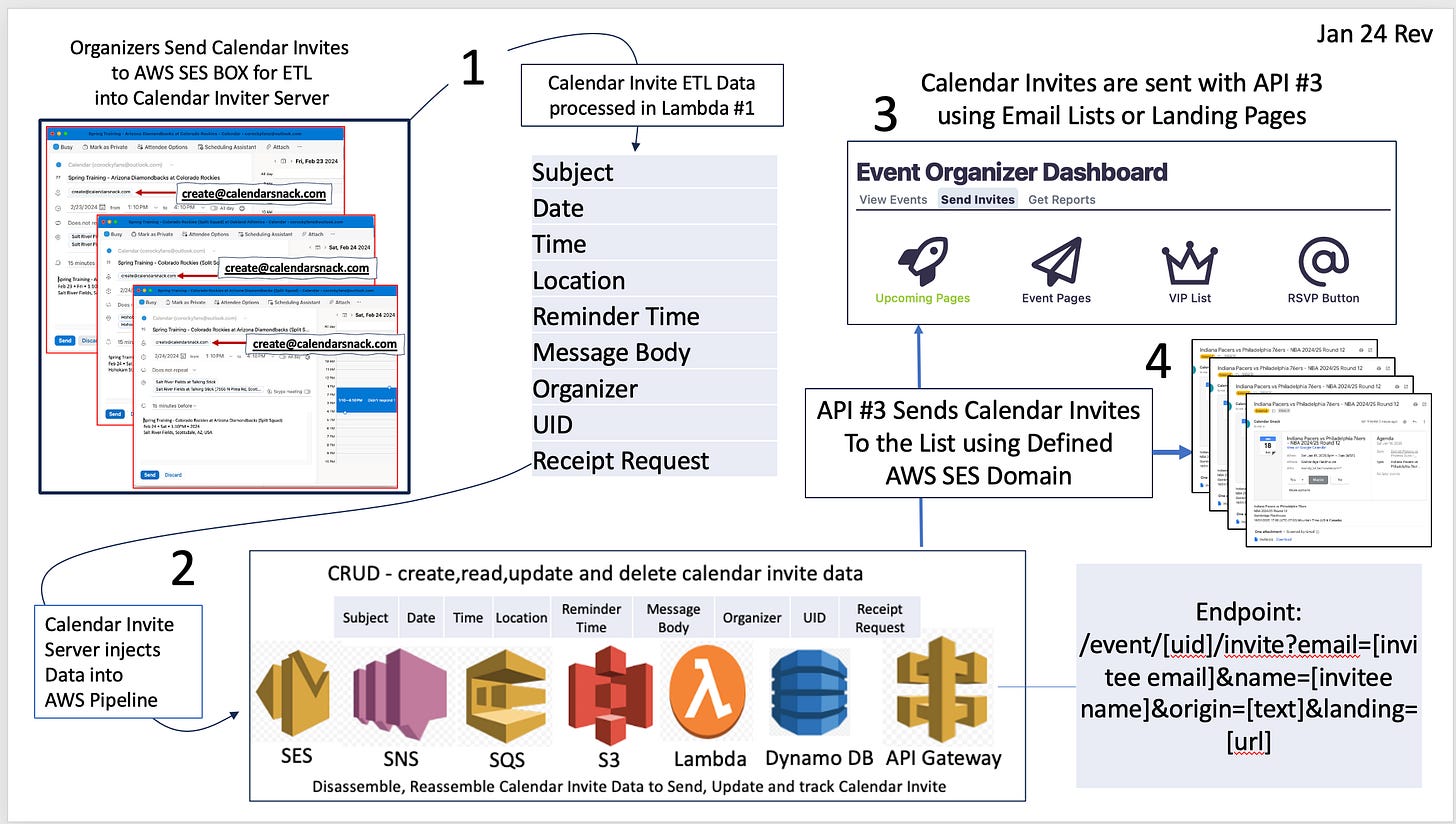 The calendar invite data is copied and stored in S3 when sent to the configured AWS SES email box. The calendar invite data from the multipart message is broken down into components using a series of Lambdas.