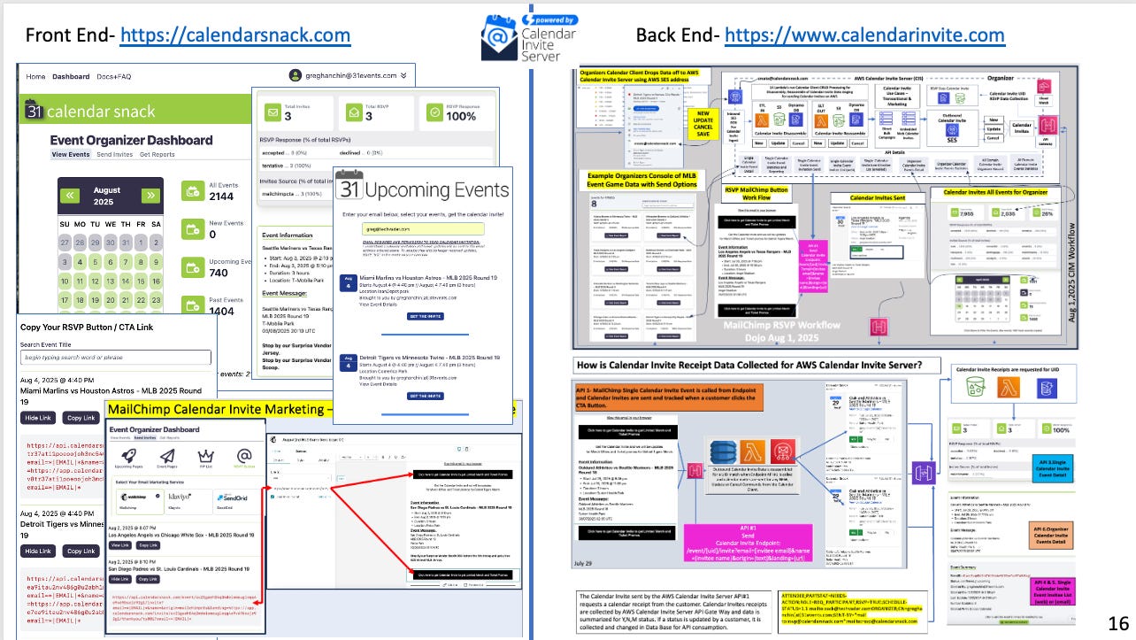 Websites with Embedded Calendar Invite API: Organizers can integrate the API into their websites, allowing customers to enter their email address and receive a calendar invite for a specific event by clicking a button. An example provided is an advanced schedule for the NFL.
