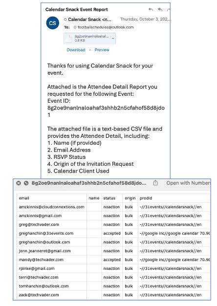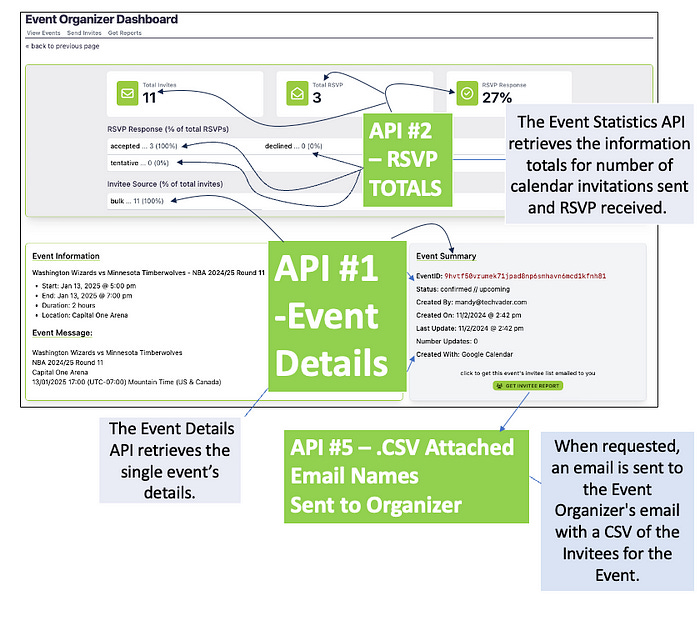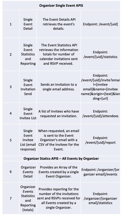 In our design example of the CalendarSnack App, we chose not to display it in the GUI but instead to “Click Here” to get the Calendar Invite RSVP report sent automatically to the organizer using API #5.