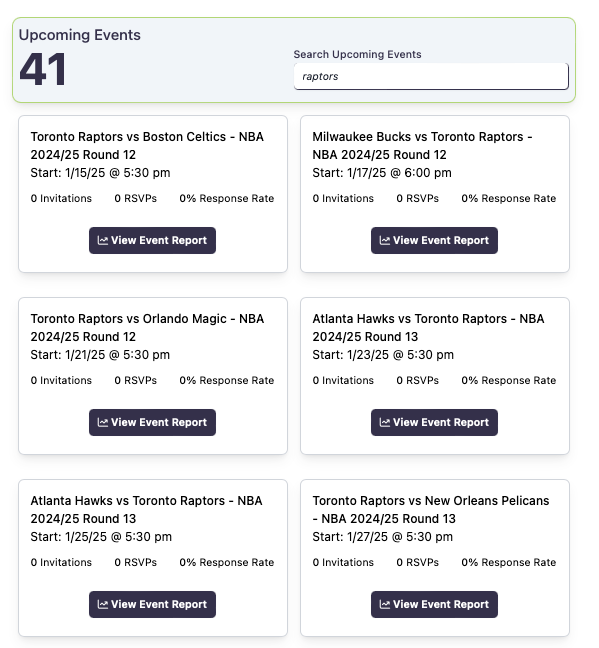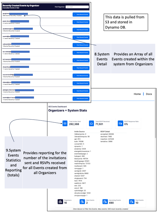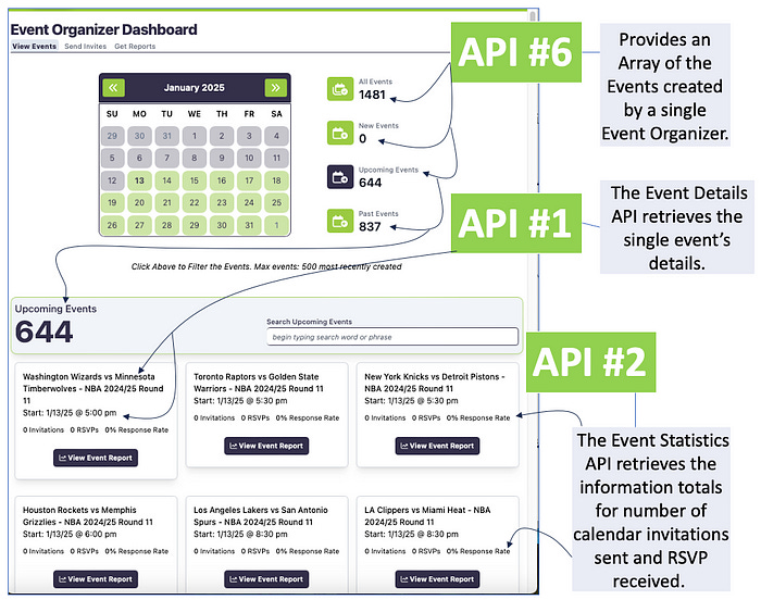 This summary Dashboard for the organizer uses API #1, API #6, and API #7.