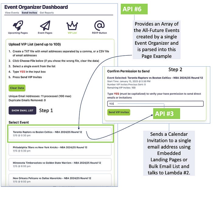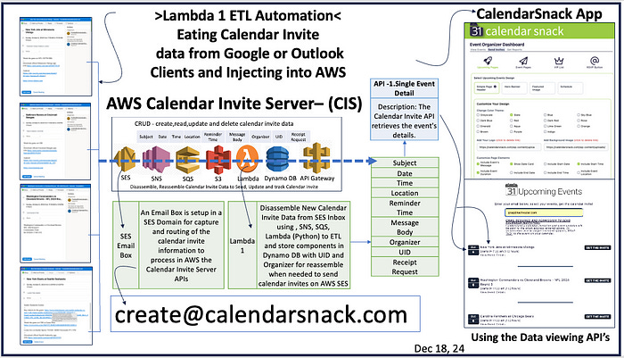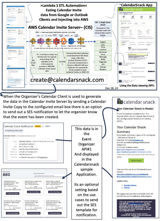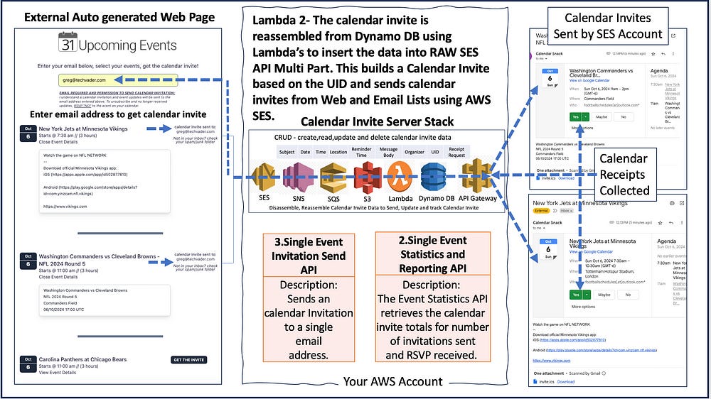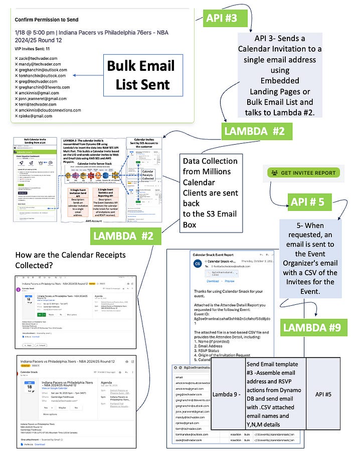 API#3 sends the Calendar Invite to the email address in the email box, calls the UID for that event, and sends it based on Lambda #2.