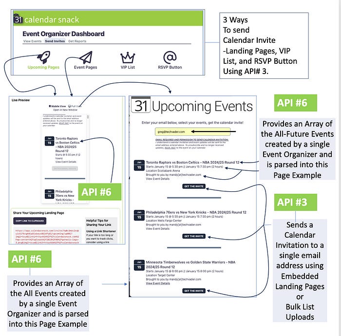 In this current build we support Direct Sending to an API#3, Embededd Calendar Invites into Landing Page Sending and an RSVP Button for Embedding the Calendar Invite into Calendarsnack.