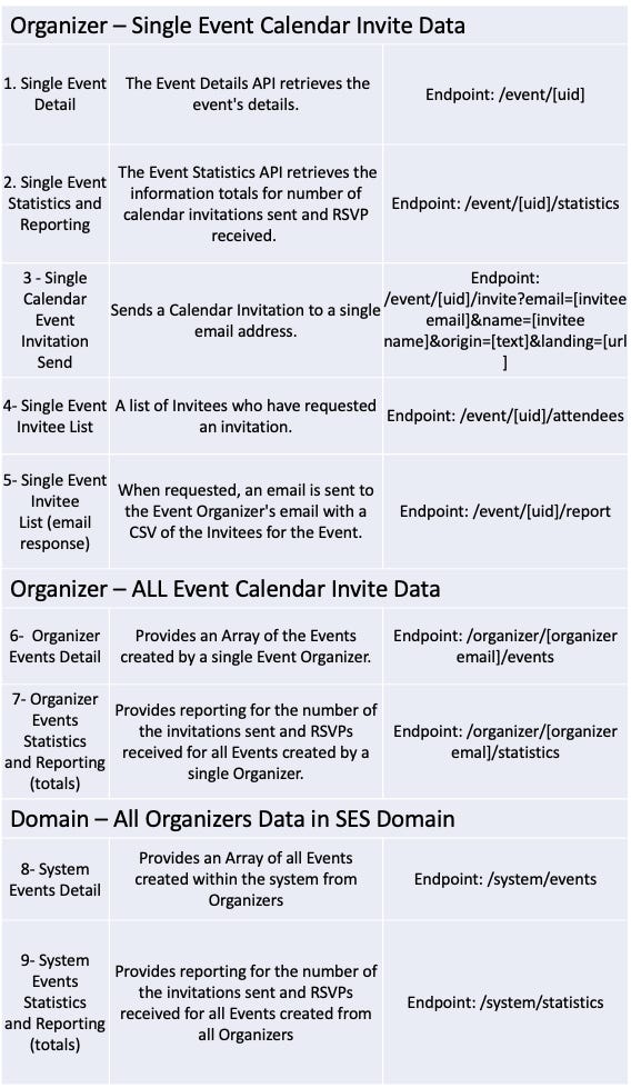 When the calendar client communicates with the Calendar Invite Server, these APIs orchestrate with the Lambdas to read, update, and delete the data related to specific UID event information for the Organizer after the Calendar Invite has been created in through Lambda #1.