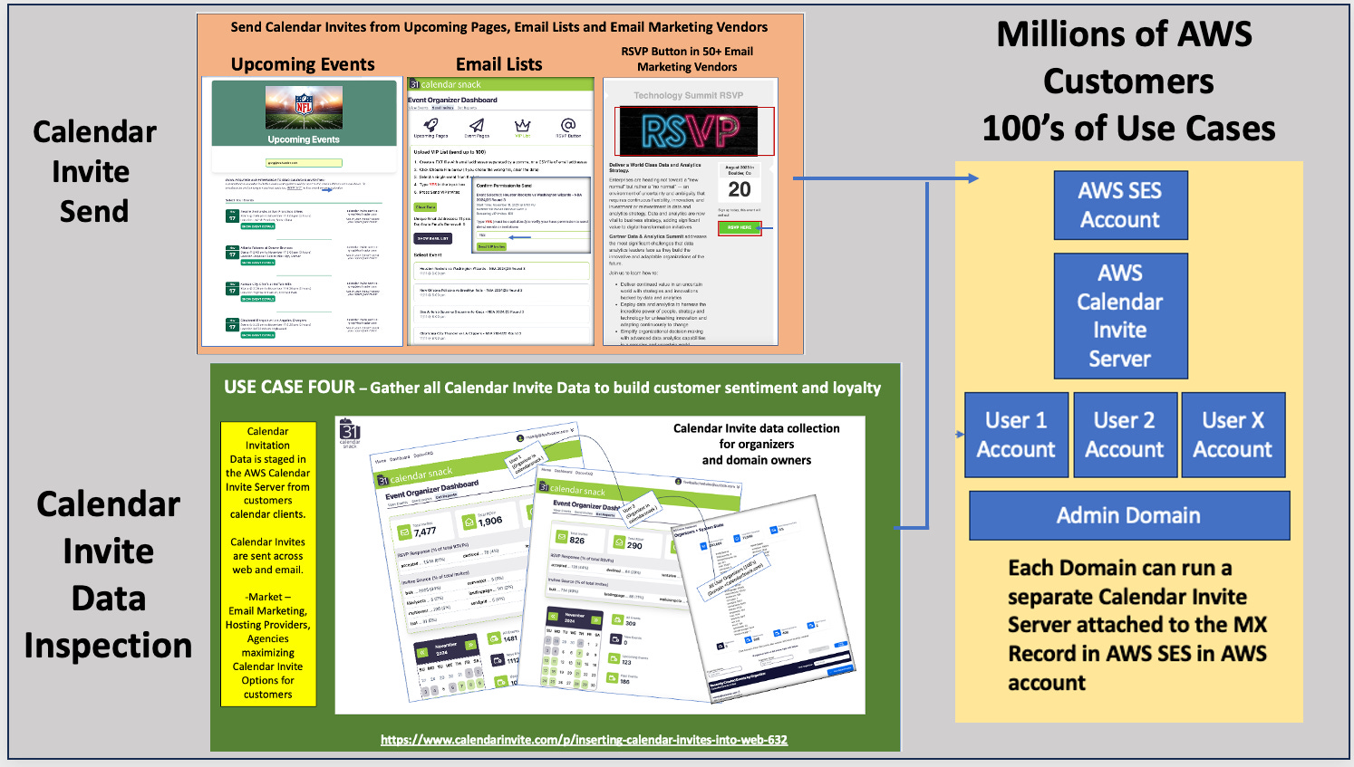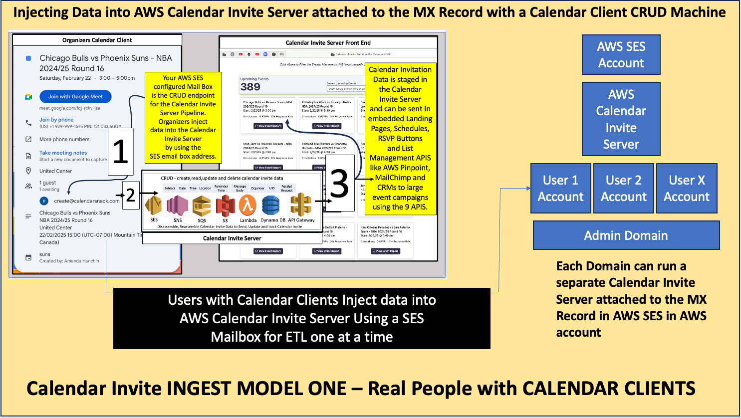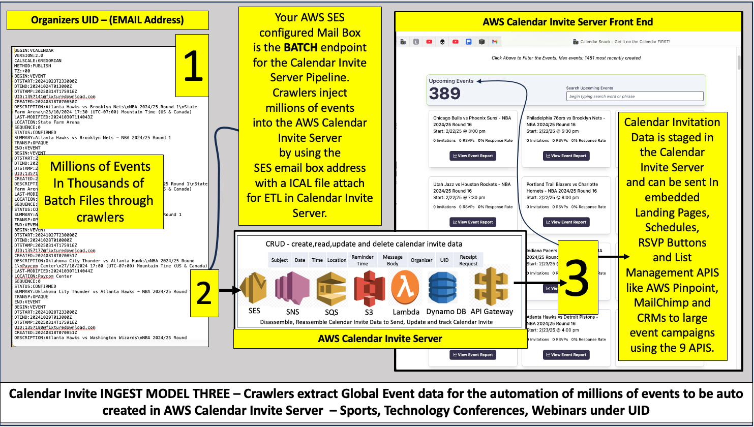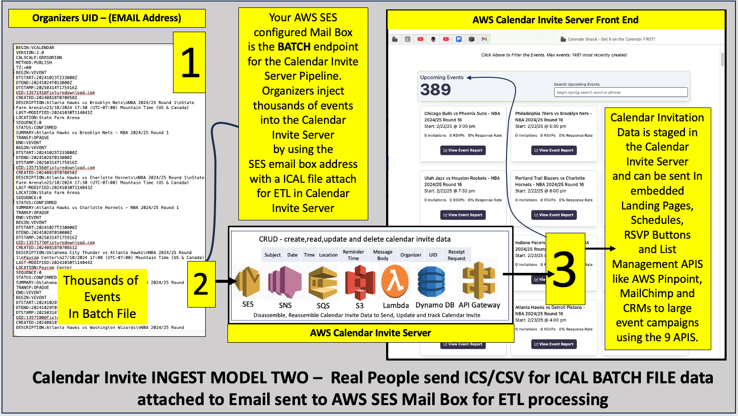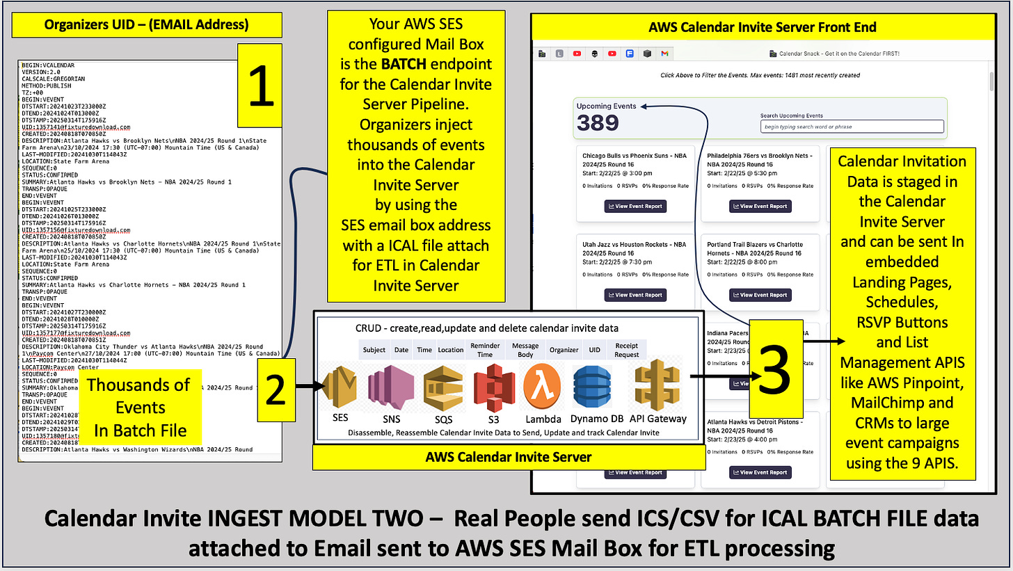 Your AWS SES-configured Mailbox is the BATCH endpoint for the Calendar Invite Server Pipeline. Organizers inject thousands of events into the CalendarInvite Server by using the SES email box address with an ICAL file attached for ETL in the Calendar Invite Server.