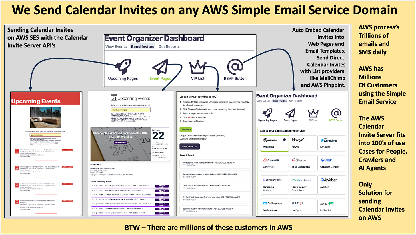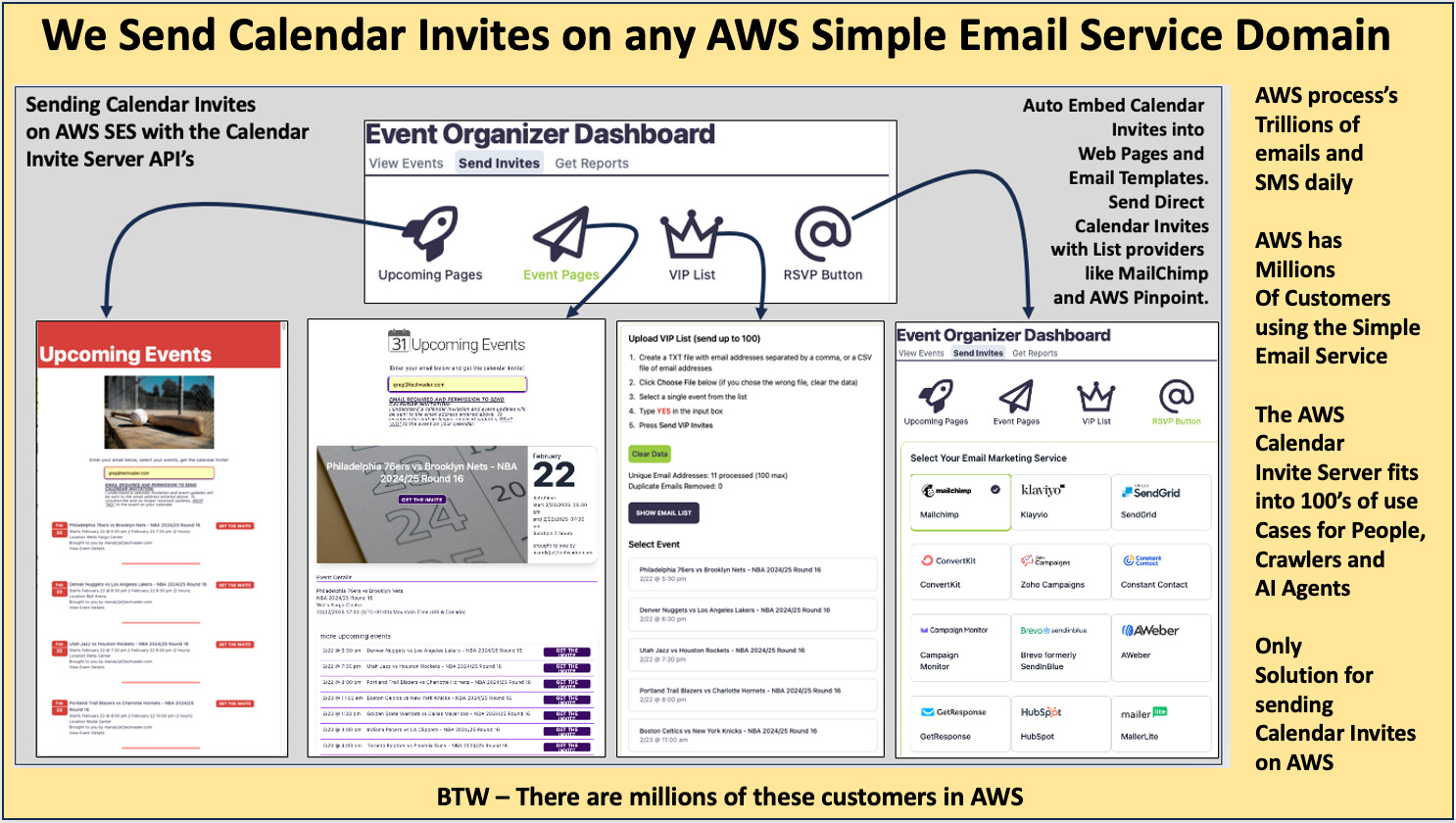 Currently, we support sending Calendar Invites on AWS SES in 3 use cases using our APIS: Upcoming Event pages, Email Marketing APIs, and RSVP buttons inside Email Marketing Vendors for One-Click Calendar Invite Send.