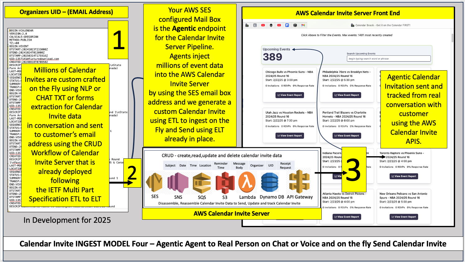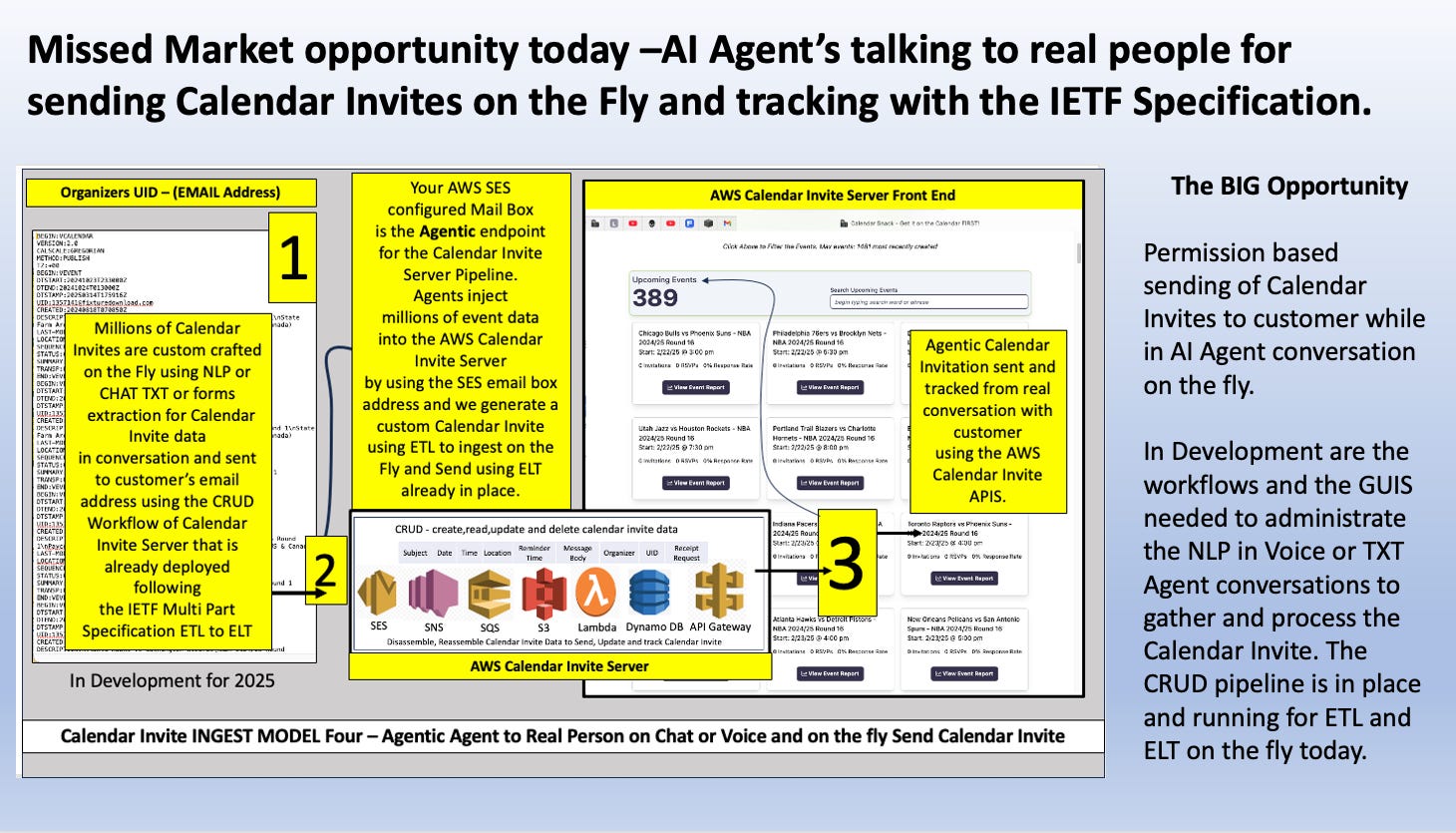 Because we already built an API to ETL the Calendar Invite data from the calendar client, this allows us to gather the Calendar Invite information from the Agent NLP with an email address, generate a calendar invite on the fly, and send it without a Google or Microsoft using AWS SES.
