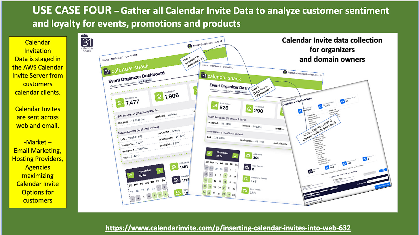 The goal is to gather data for the organizer and the domain super users from the calendar receipts and provide a way for the organizer to update the calendar invites using the built-in IETF specification for the calendar invite server with the AWS pipeline we have built.