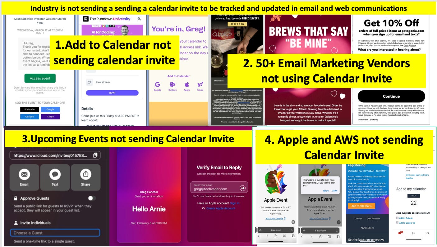 In #4, many global brands like Nike, Apple, and AWS still have not solved global product launches and events, let alone figured out how to stream all upcoming events into a webpage, insert an email box, and click send for a calendar invite.