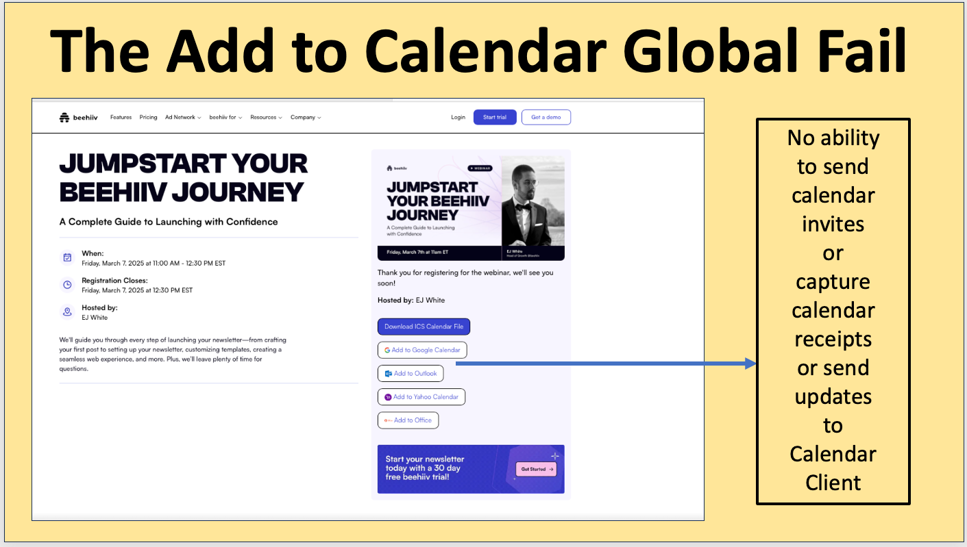 In #1, we see that the Add to Calendar sometimes works but most times offers a confusing experience with the Google Calendar App opening and forcing logins. It does not work well on Outlook, and it's debatable why you would Yahoo even in the picker. We commonly see this after a single event, "Registration" Signup.