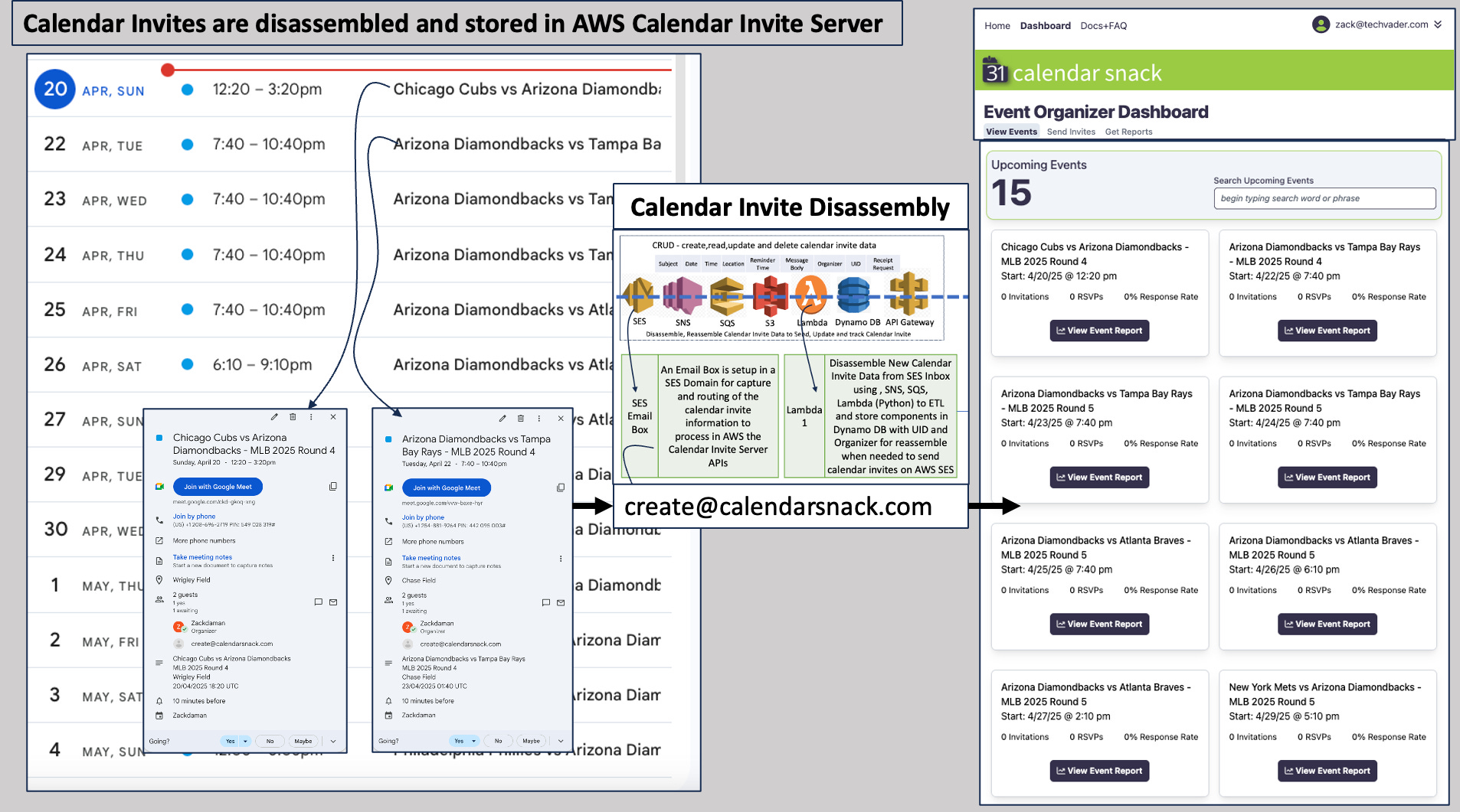 The Organizer sends a Calendar Invite to an AWS email box, and the data is disassembled, assigned a UID, and stored on the AWS Calendar Invite Server for future calendar invite sending for transactional or marketing calendar invite sending.