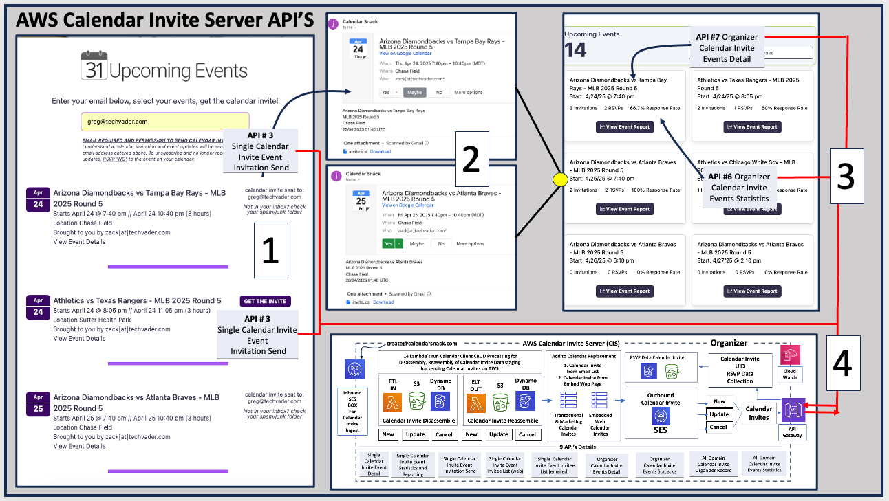 The Calendar Invite solicits an RSVP response, and the RSVP data is collected in # 3 in the dashboard when a customer clicks Y, M, or N in their calendar clients.