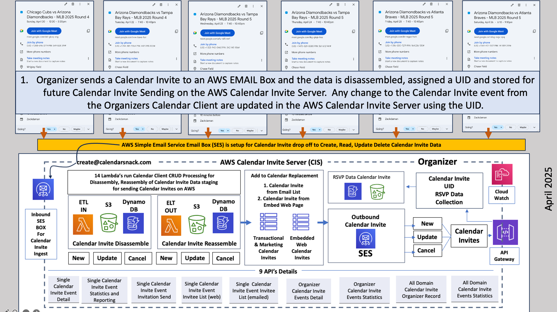 The novel idea here is to use an email account to AWS SES “Mail Box” hooked to S3 to start the data CREATE, READ, UPDATE and CHANGE processing from millions of calendar clients.