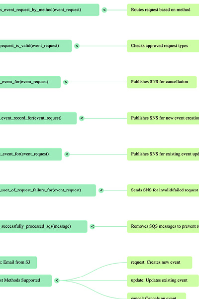 Routing to Appropriate Processing: Based on the request method, the function "Routes the request to the appropriate SNS topic for further processing." This decouples the initial email processing from the specific actions (creation, update, cancellation).