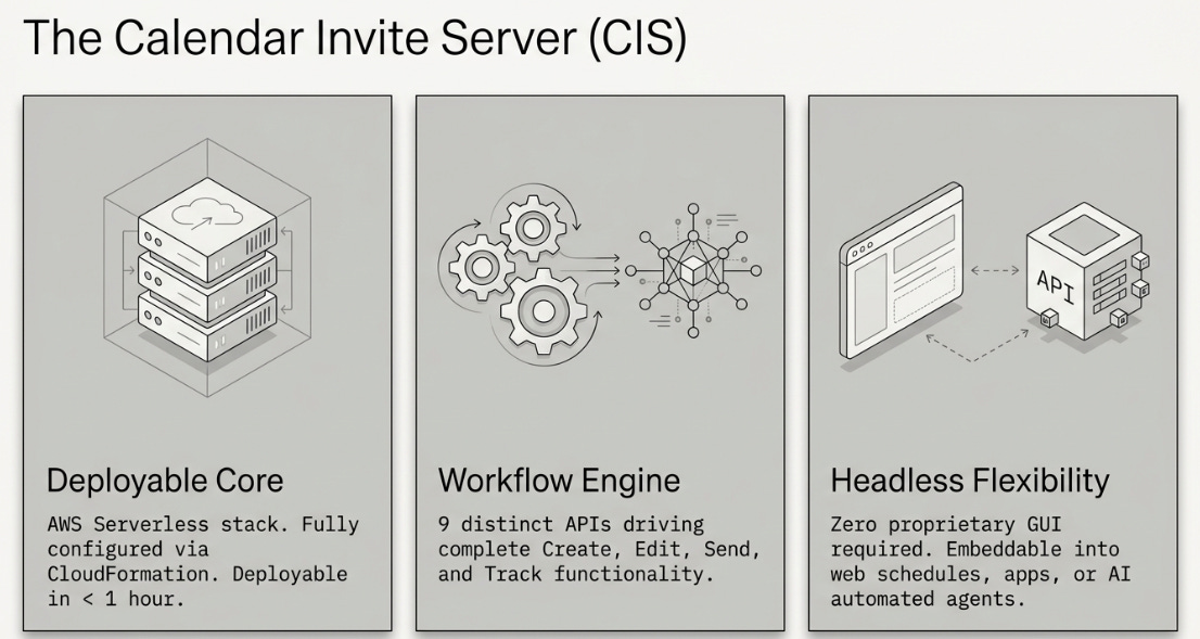 For AWS developers, the value is immediate: the entire Calendar Invite Server can be deployed in under an hour using CloudFormation and an AWS SES account.