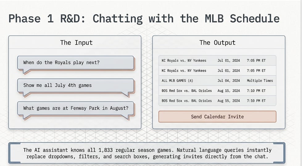 • The AI holds the full schedule in its context window — natural language queries replace dropdowns, filters, and search boxes.