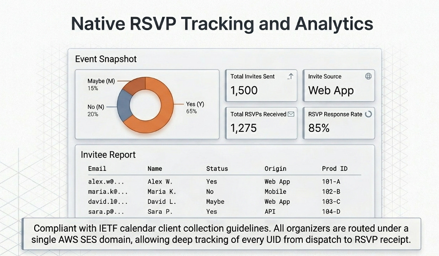 By monitoring Y/N/M (Yes, No, Maybe) calendar receipts via an API Gateway, the system tracks every interaction in accordance with IETF collection guidelines.