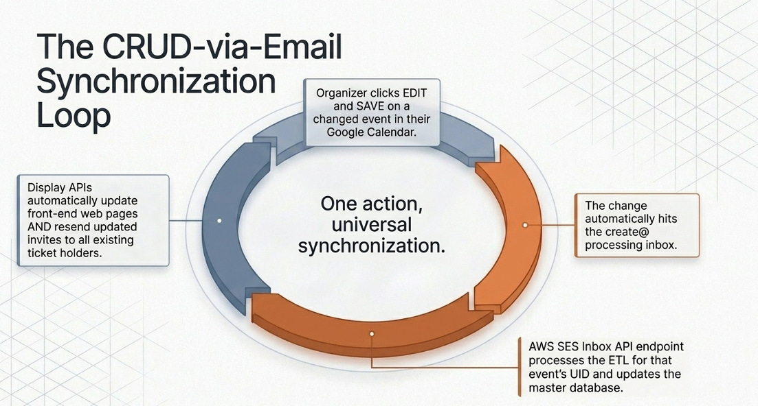 When an event is sent to this address, the system processes the calendar invite data, assigns a Unique Identifier (UID), and stores the event details in a database.