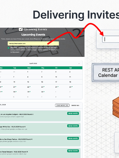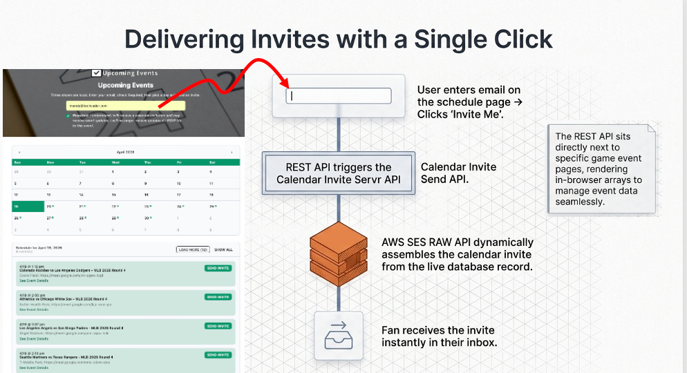 When a user enters their email, the system invokes the AWS SES RAW API to assemble and send a tracked calendar invite instantly.