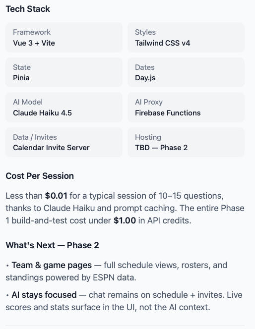 This app is a Phase 1 R&D experiment by 31Eventsdemonstrating how the Calendar Invite Server infrastructure can power an AI-driven fan experience — built in an afternoon, running on pennies per session.