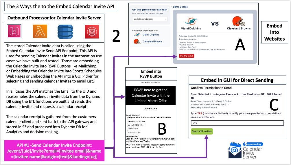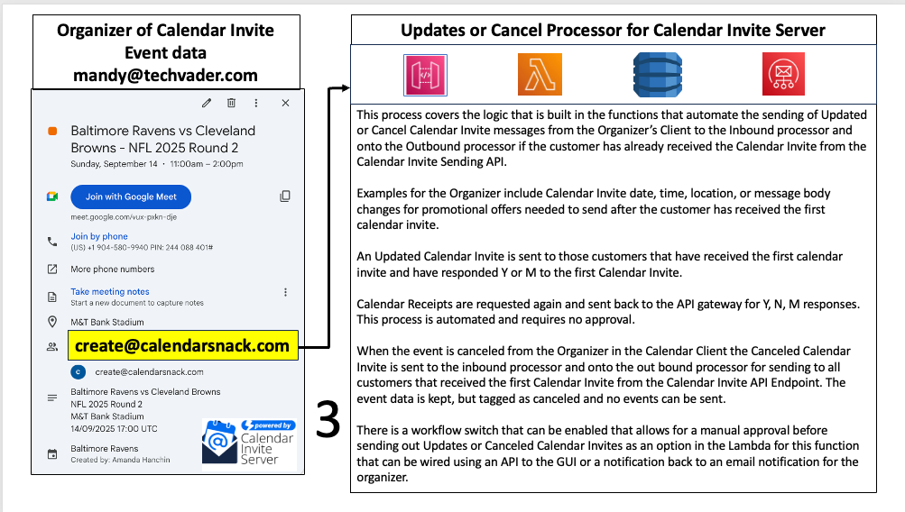 Invite Reconstruction: The Lambda function reassembles the retrieved components "on demand" into a complete, standards-compliant calendar invite. This ensures that the invite is always constructed from the most current data stored in the database.