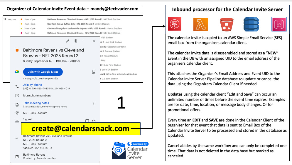 Reception: The AWS Simple Email Service (SES) is configured to monitor this address and receive incoming emails containing the calendar invitation.