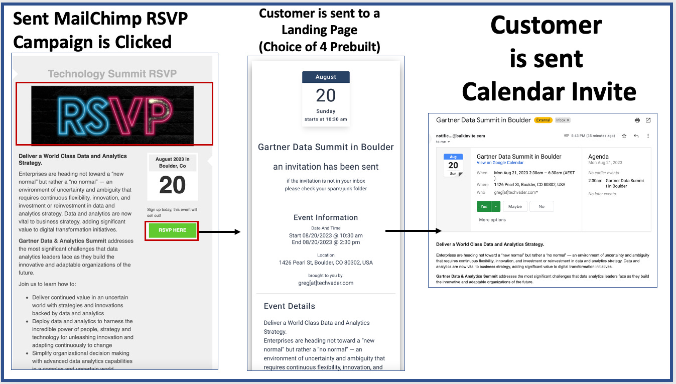 How - Send a calendar invite to the AWS SES Mailbox. This kicks off a function in the Calendar Invite Server and sends back to the organizer email address the RSVP Button code is ready to embed into the email marketing platform.