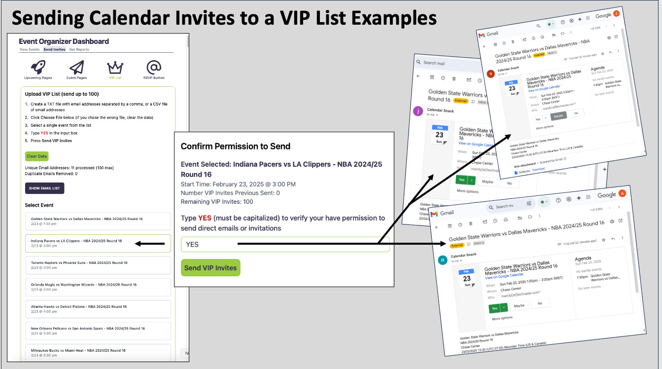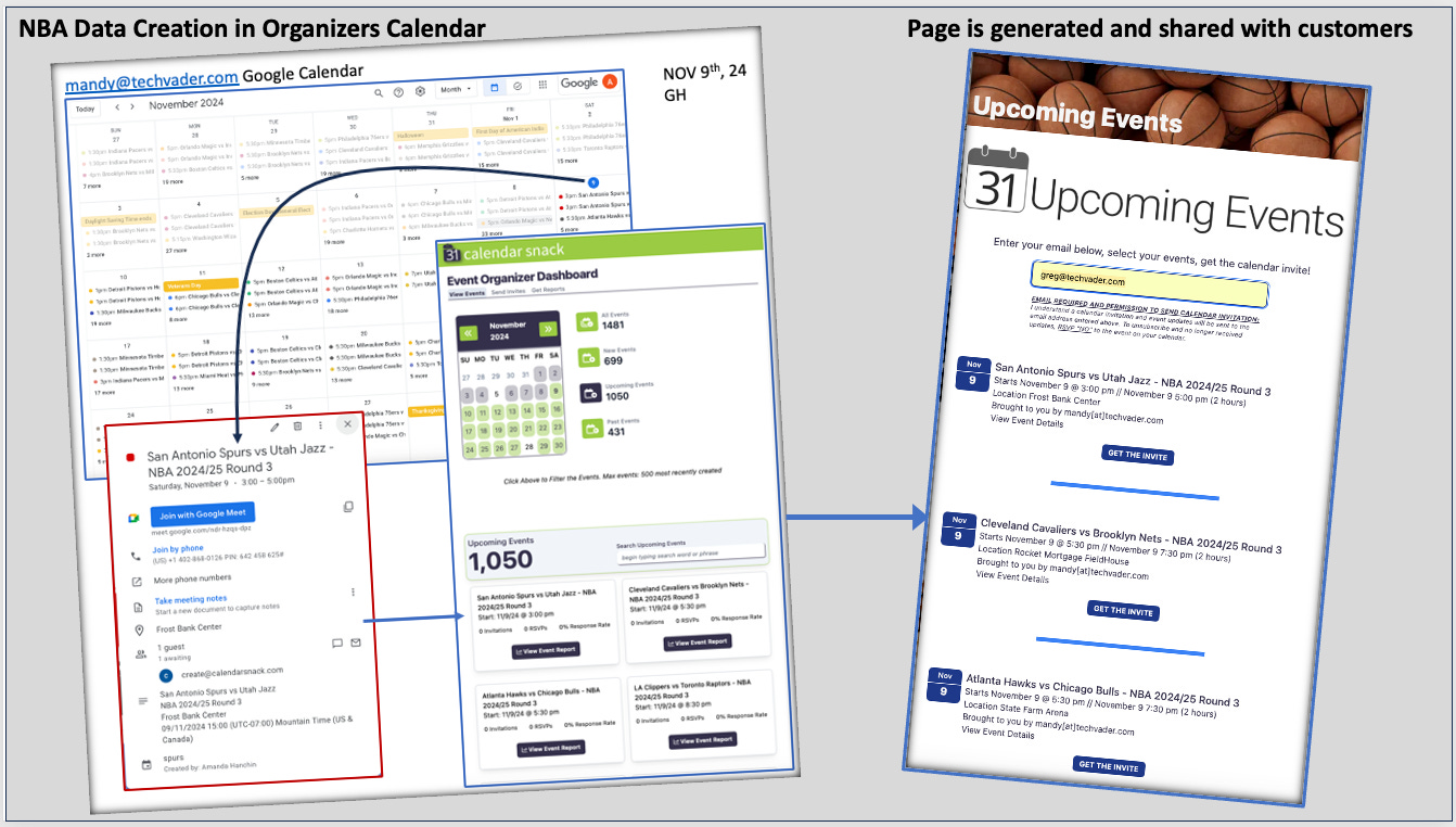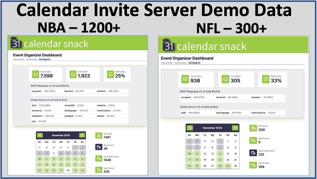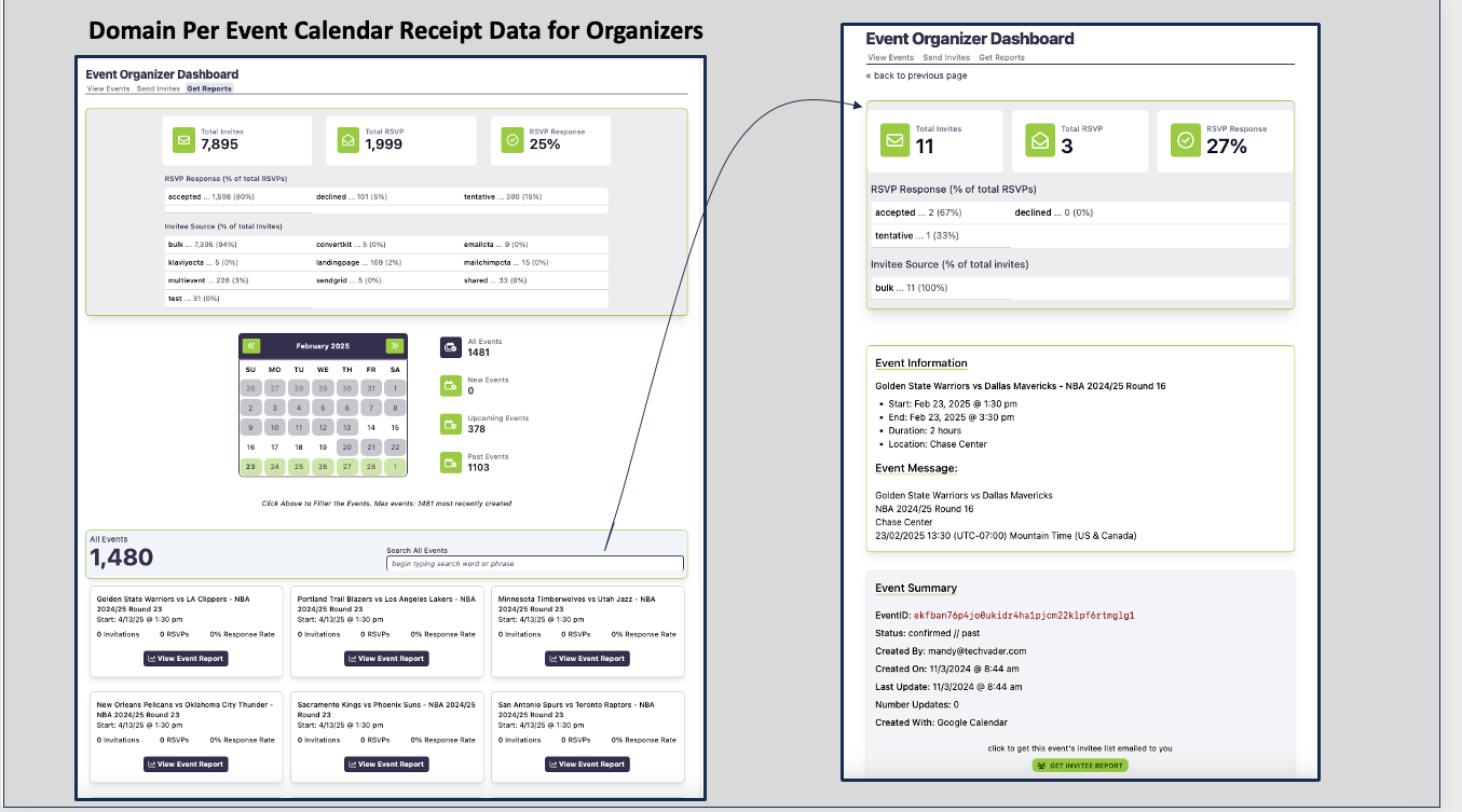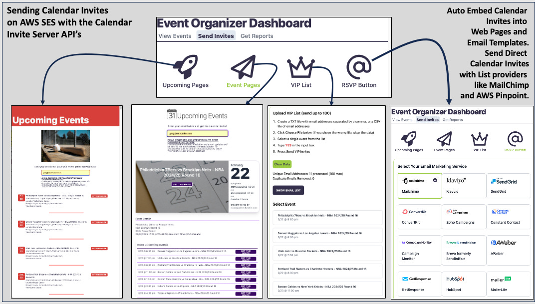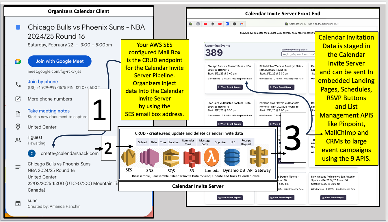 In the NBA game schedule in this posting, we sent the calendar invites to the AWS SES box configured called create@calendarsnack.com and displayed the data in the Dashboard for Sending and Data Collection of the Calendar Invites for customer campaigns using there AWS Server-less stack.