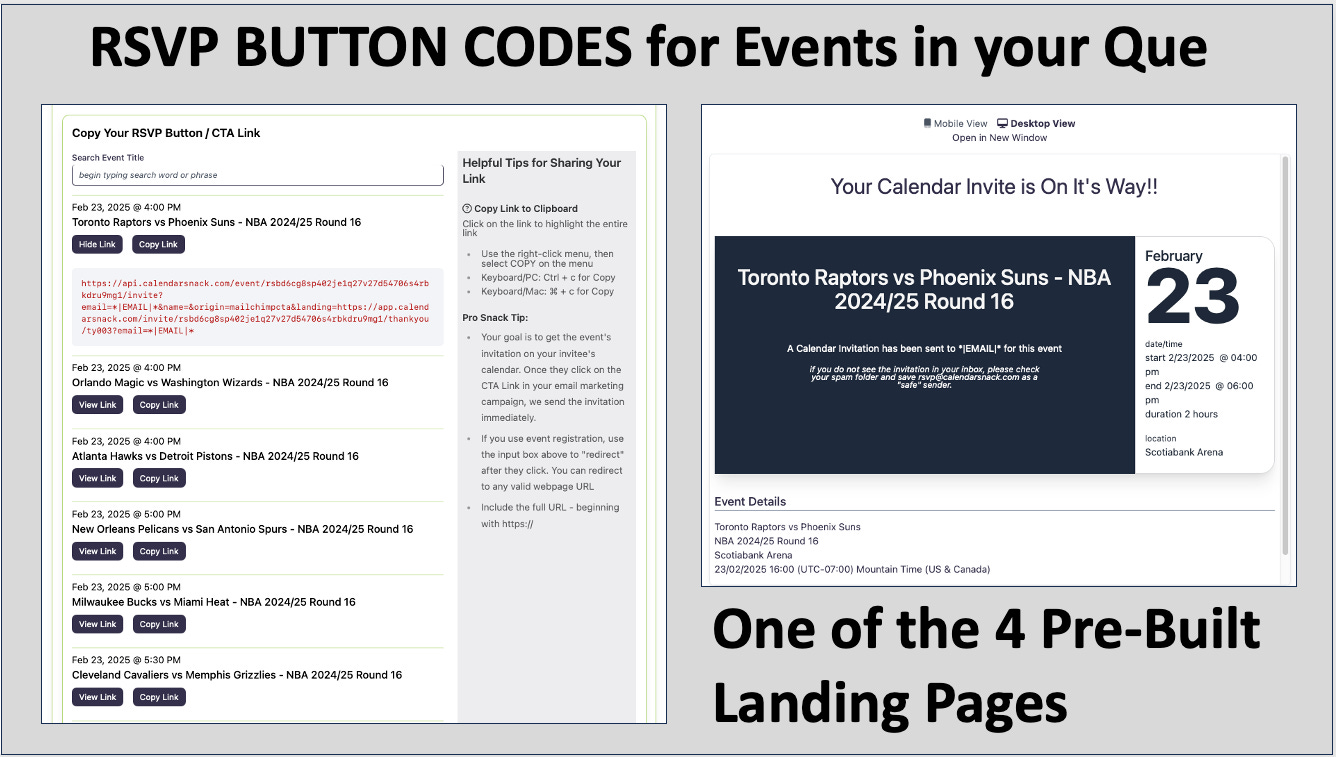 When the CTA embed is inserted into the Email Marketing platform a Calendar Invite is sent and tracked and the user is sent to a landing page of their choice.