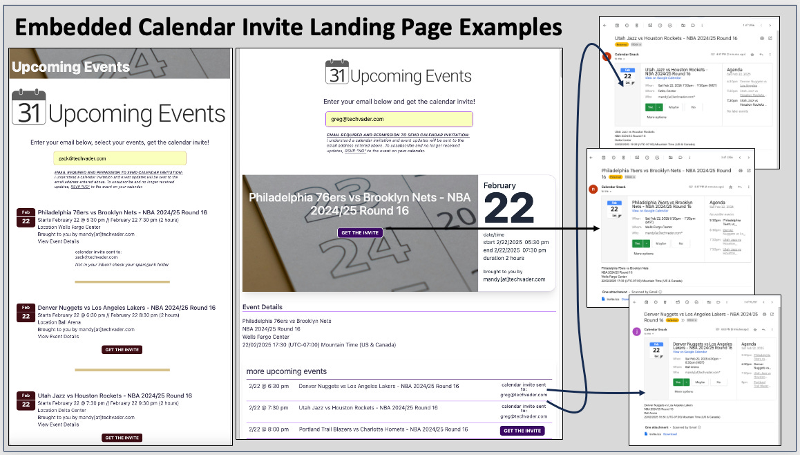 The Get API request is formatted with the VUE.JS application to insert the Calendar Invites into the page in chronicle order with the exposed calendar invite details. The Email Box is adjacent to the Calendar Invite data on the page. When a customer puts the email address in the box, they can click the button and receive the calendar invite from the Calendar Invite API #3.