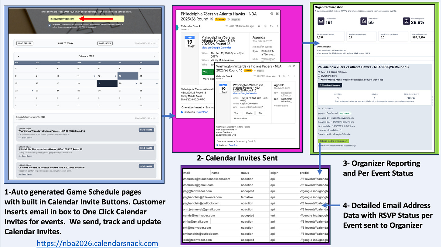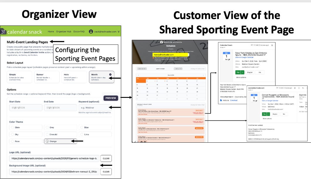 The compiled workflow looks like this when moving from the Organizer View to the deployed shared page, where the customer can select and receive calendar invites sent to the email address they insert into the Sport Event page.