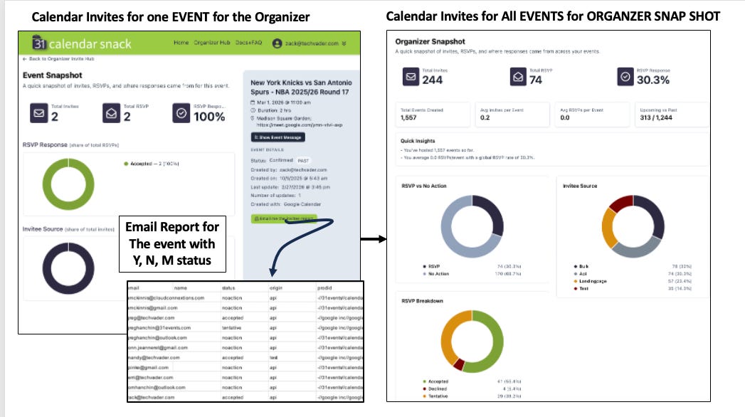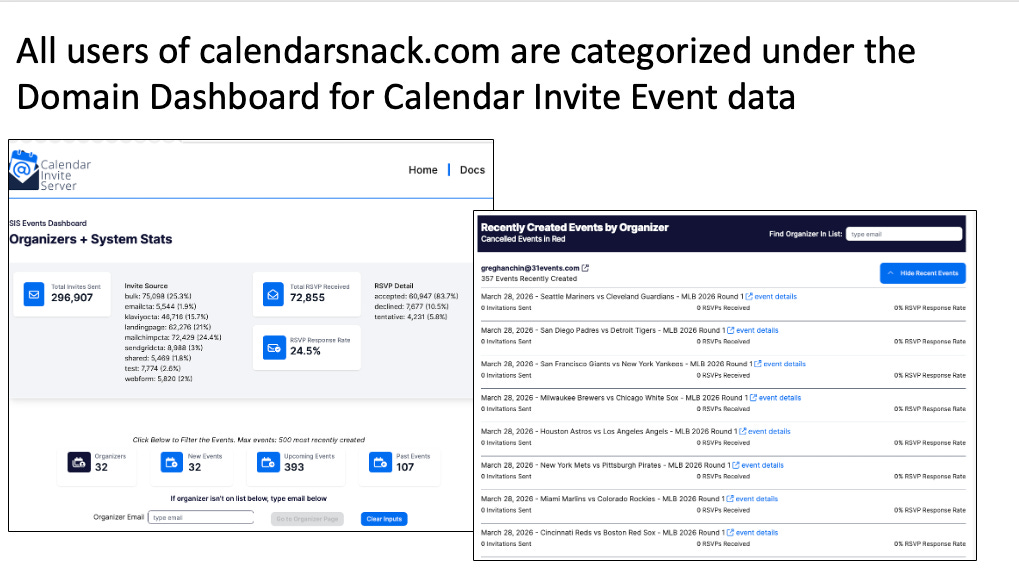 All Calendar Invite Events processed by the API’s and used in Email or Sport Pages are tracked for all Organizers under the domain owner.