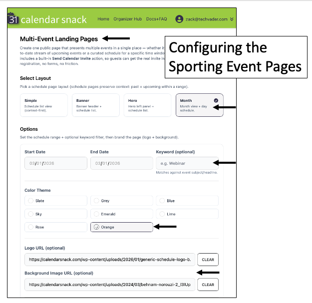 The Multi Event configuration page helps the organizer determine the layout for Single or Multi Event, and how the Sporting Events should be visually laid out with colors, dates, and Optional Logos and background URLs.