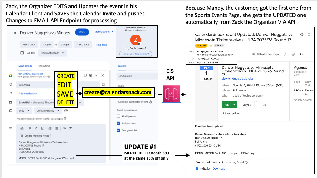 Zack, the Organizer EDITS and Updates the event in his Calendar Client and SAVES the Calendar Invite and pushes the changes to the EMAIL API Endpoint for processing.