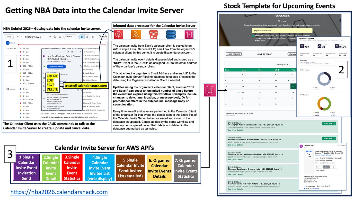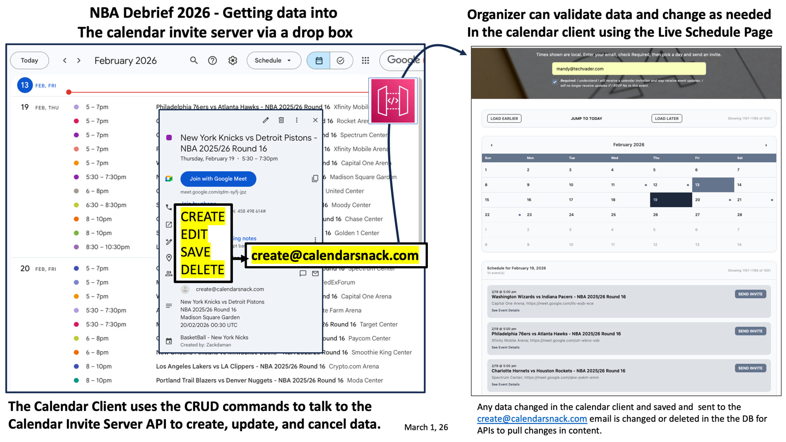 The Calendar Invite Event data is updated in the DB, and the API pulls the new data to the Sports Event page.